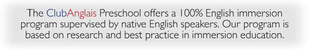 Research conducted by Kuhl (2010) and others indicates that the best time for your child to learn a foreign language is between the ages of 2 and 7 (click here to read research). At ClubAnglais your child will be completely immersed in English all day, every day under the supervision of native English speakers. We will be implementing best practice in immersion education based on research from the Center for Advanced Research on Language Acquisition (www.carla.umn.edu). Our curriculum was developed specifically for immersion preschools by add.a.lingua (www.addalingua.com), leaders in immersion education in the United States. |